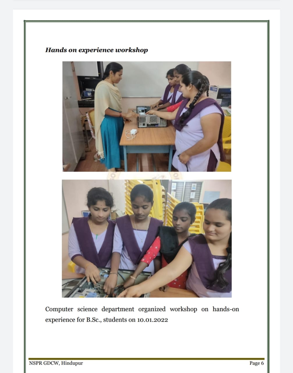 Dept. of Computer Science , NSPR Government Degree College for Women, Hindupur organized science exhibition in the event of National Science Day on 28/02/2022. All BSC (CS) are prepared experiments regarding computer technology topics like satellite communication, multi-messenger, topology, computer network etc.